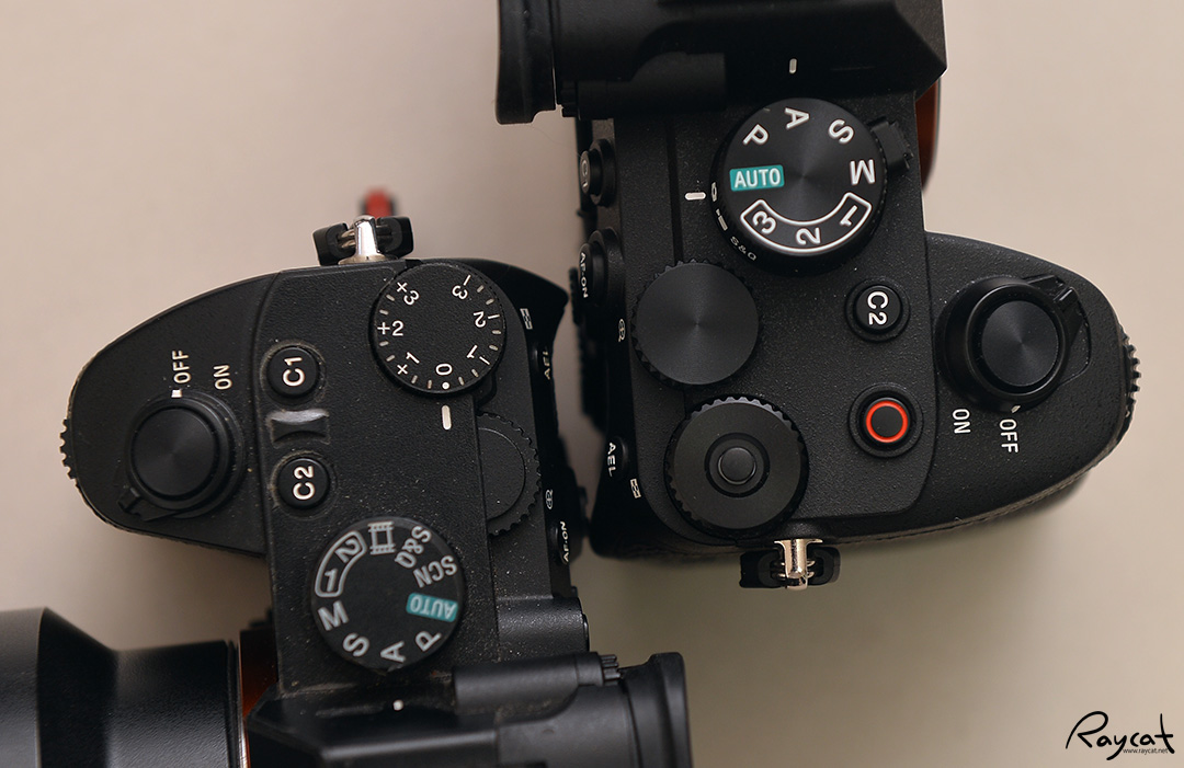왼쪽 다이얼 버튼에 노출 숫자가 표시된 바디가 a7m3이며 a7m4의 숫자 표기가 없어지고 다이얼 버튼이 더 부드럽게 돌아가도록 바뀌었으며 영상 녹화 버튼이 위쪽으로 좀 더 누르기 편한 위치에 자리 잡고 있습니다.