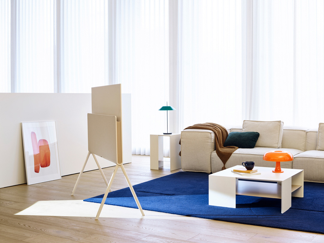옆에서 바라보면 패널과 본체가 U자를 그리는 곡선 디자인이 보이며 패브릭을 적용한 외관은 TV를 어느 각도에서 보더라도 인테리어 소품이 놓인 것처럼 깔끔하게 보이며 본체를 지지하는 스탠드는 안쪽에 전원선 등을 넣어 숨길 수 있도록 설계해 기존 TV와 다른 느낌으로 깔끔하게 공간을 정리해 줍니다.