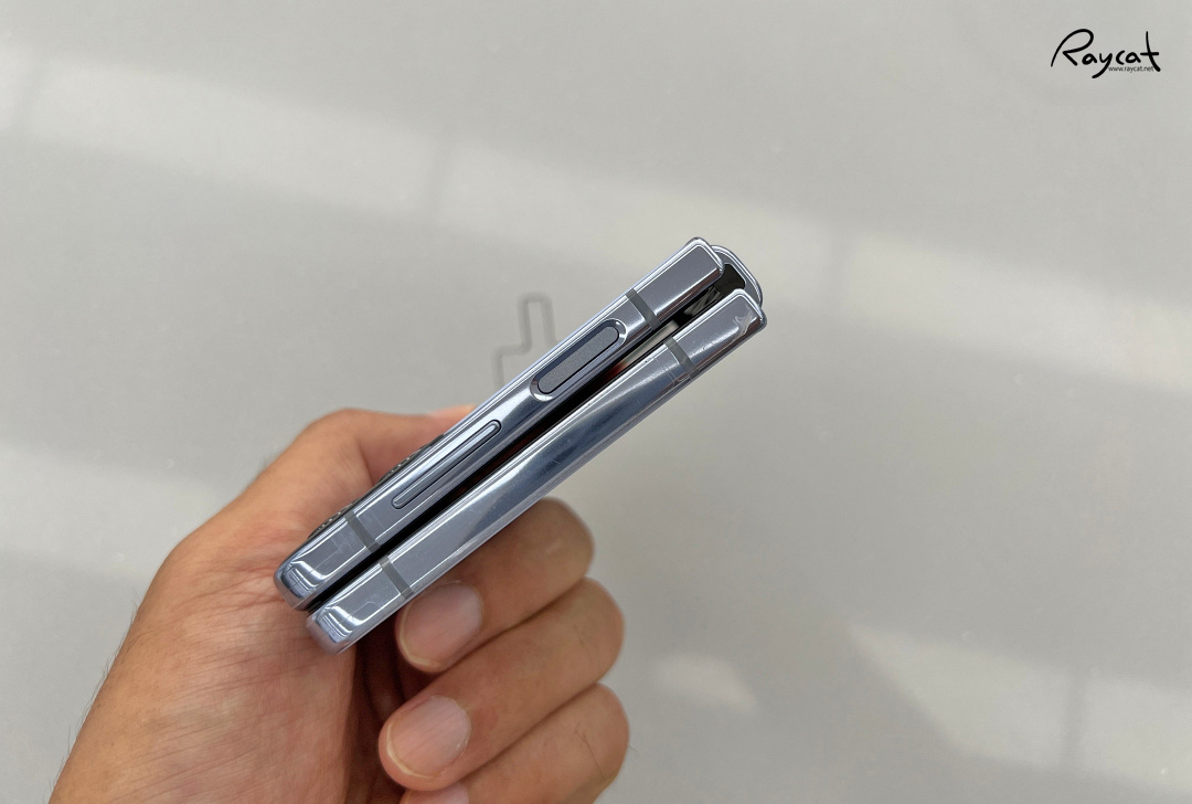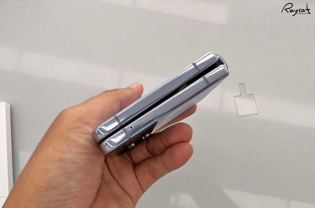 파스텔톤 느낌의 블루로 갤럭시 Z 플립4와 잘 어울리는 느낌으로 이번 갤럭시 플립4를 보면 외형에서 가장 큰 차이는 접히는 부분의 힌지의 두께가 조금 줄었다는 점입니다.