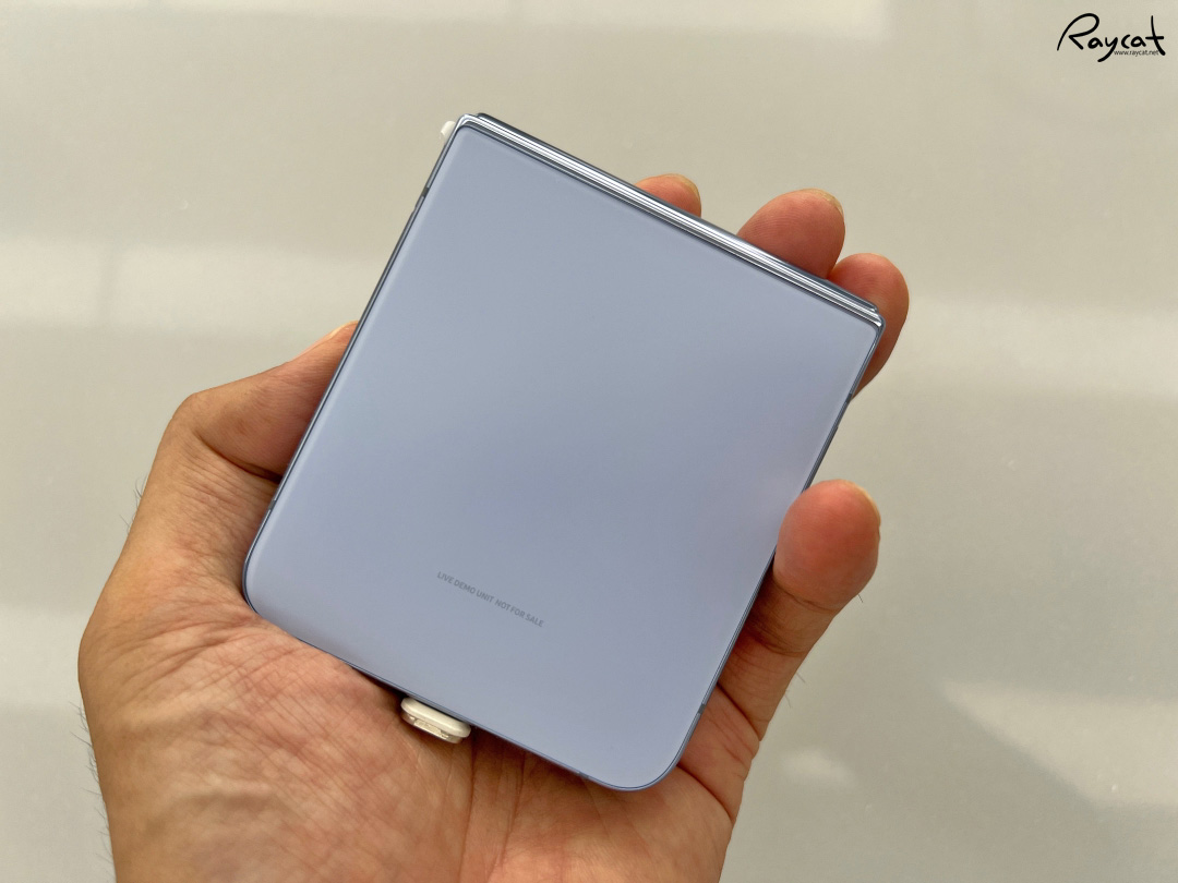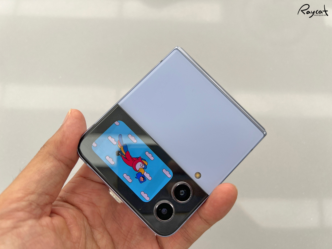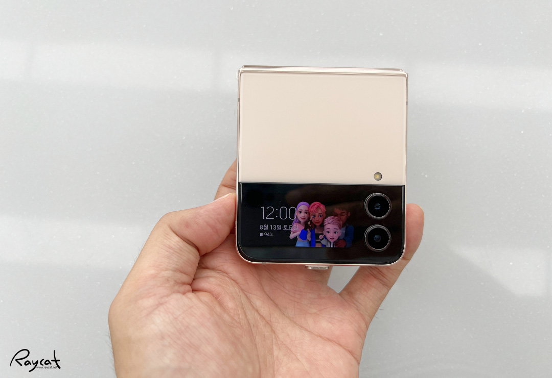 디자인은 사실 컬러만 제외하면 힌지의 두께가 조금 줄었다는 느낌이 있지만 이전 갤럭시 Z 플립3와 큰 차이를 느끼긴 힘듭니다. 단 좀 자세히 보면 카메라 센서가 바뀌면서 전면 커버 디스플레이의 카메라가 조금 더 튀어나왔다는 느낌이 있습니다.