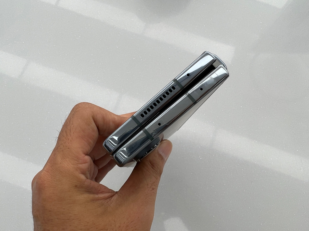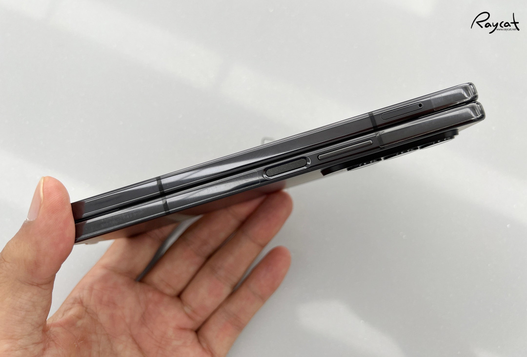 측면을 보면 기존과 동일하게 유심슬롯, 지문 센서, 볼륨 버튼이 있습니다. 그리고 이번에 가장 달라진 부분은 힌지쪽인데 힌지의 두께가 이전보다 확실히 얇아진 느낌을 줍니다. 그리고 카메라의 경우 더 큰 센서를 적용하며 카메라가 조금 더 튀어나와 있습니다.