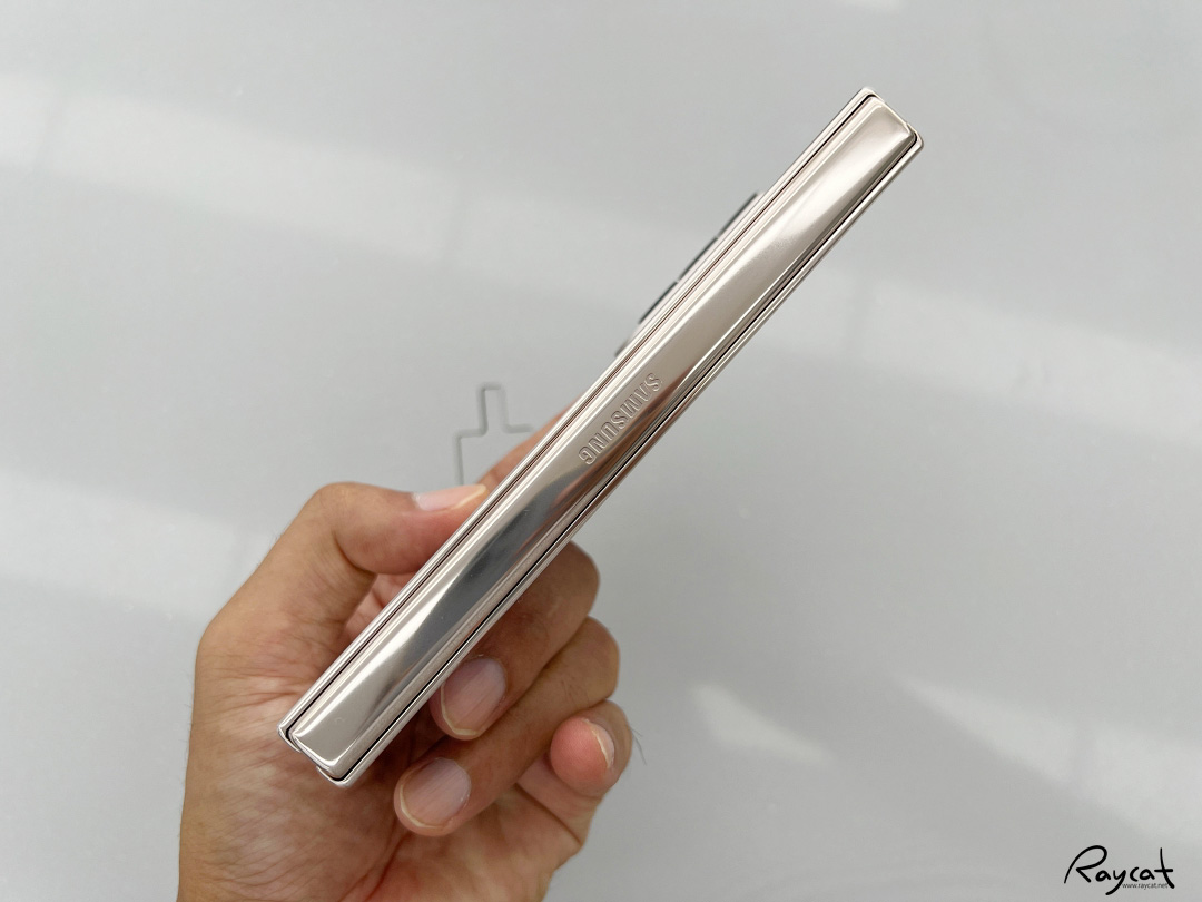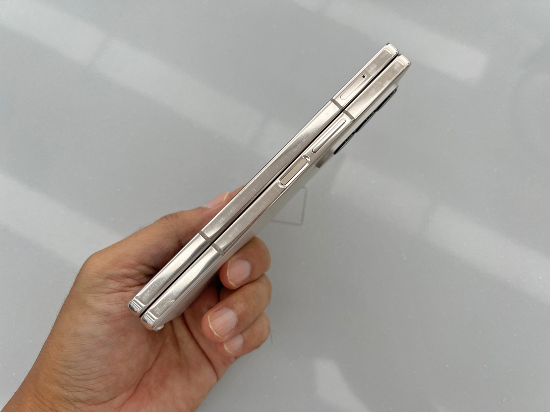 측면을 보면 기존과 동일하게 유심슬롯, 지문 센서, 볼륨 버튼이 있습니다. 그리고 이번에 가장 달라진 부분은 힌지쪽인데 힌지의 두께가 이전보다 확실히 얇아진 느낌을 줍니다. 그리고 카메라의 경우 더 큰 센서를 적용하며 카메라가 조금 더 튀어나와 있습니다.