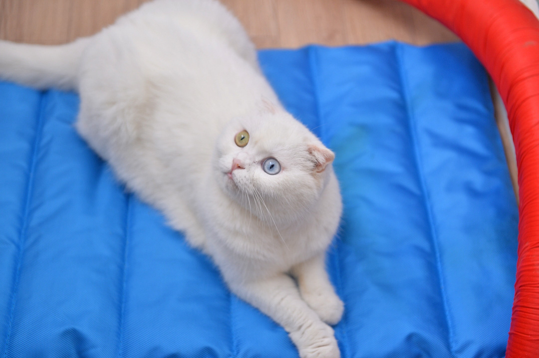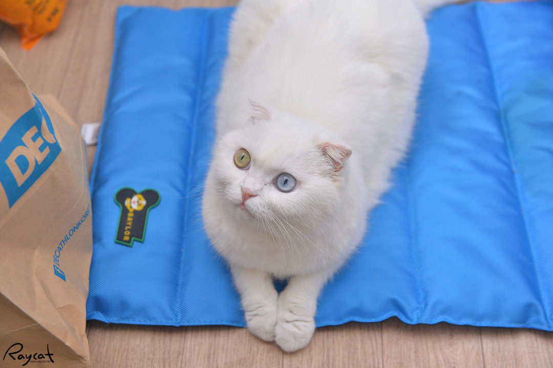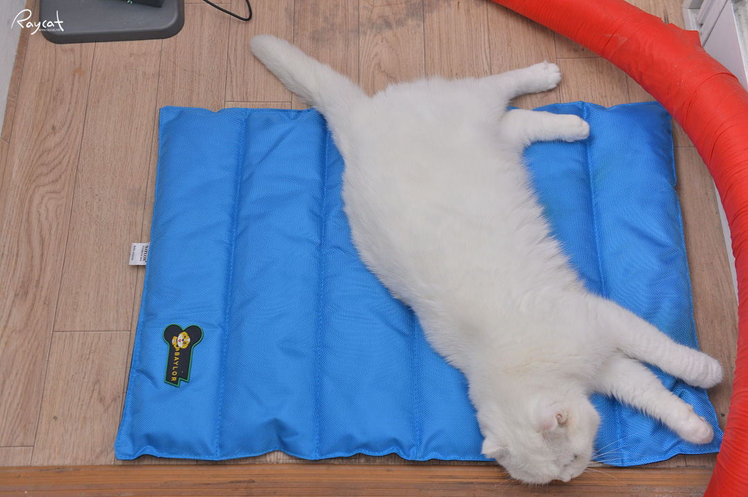 쿨매트를 깔아주면 일월이 뛰어 들어와 쿨매트 위에 올라가 더위를 피한다. 일월도 쿨매트가 꽤 마음에 드는 눈치다.