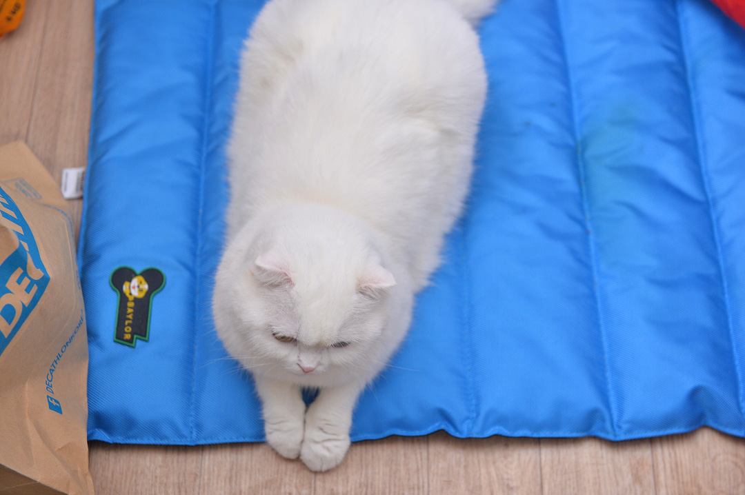 쿨매트를 깔아주면 일월이 뛰어 들어와 쿨매트 위에 올라가 더위를 피한다. 일월도 쿨매트가 꽤 마음에 드는 눈치다.