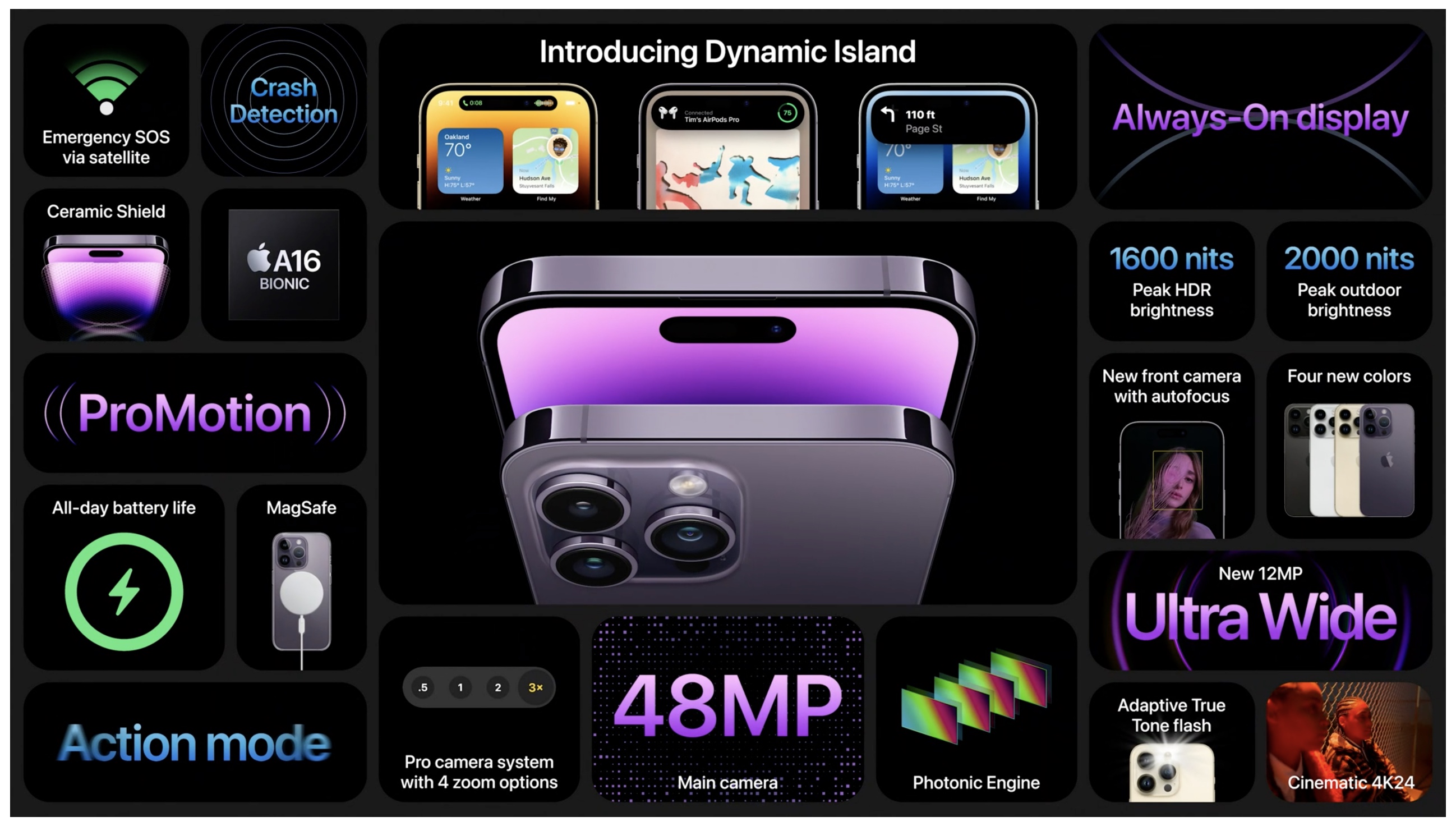 14 Pro: 6.1인치, 14 Pro Max 6.7인치 OLED 디스플레이가 적용되었으며 야외에서 시안성이 좋도록 밝기는 1600니트 야외에서 최대 2천 니트까지 밝아집니다.