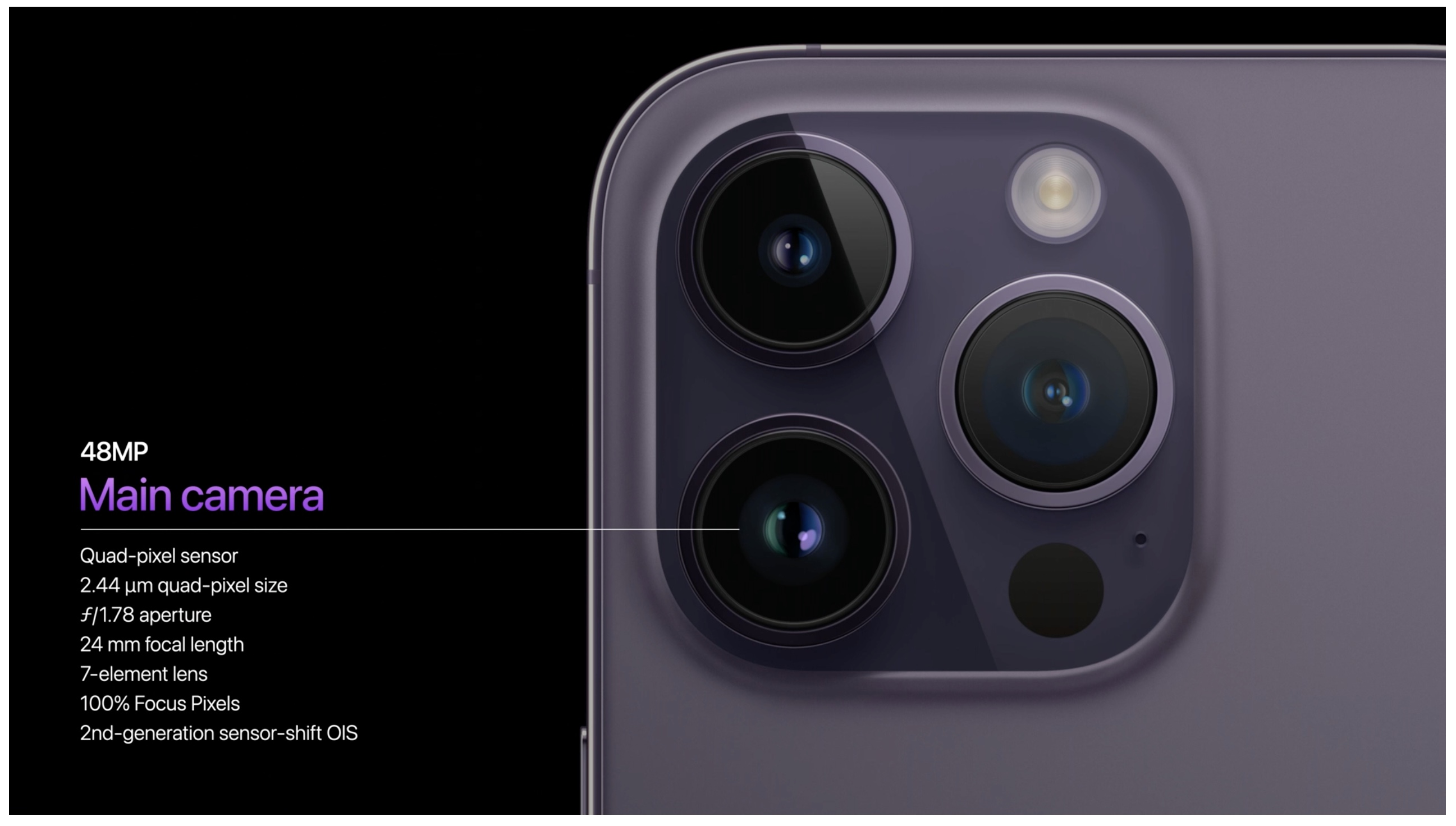 아이폰14 프로 시리즈에 적용된 메인 카메라의 경우 아이폰13 프로보다 65% 커진 센서 진보된 2세대 센서 시프트 OIS, 100% 포커스 픽셀 Photonic Engine으로 아이폰13 Pro에 비해 최대 2배 저조도 성능 빛 포착 최대 3배 개선되었으며 액션 모드도 추가되었습니다.