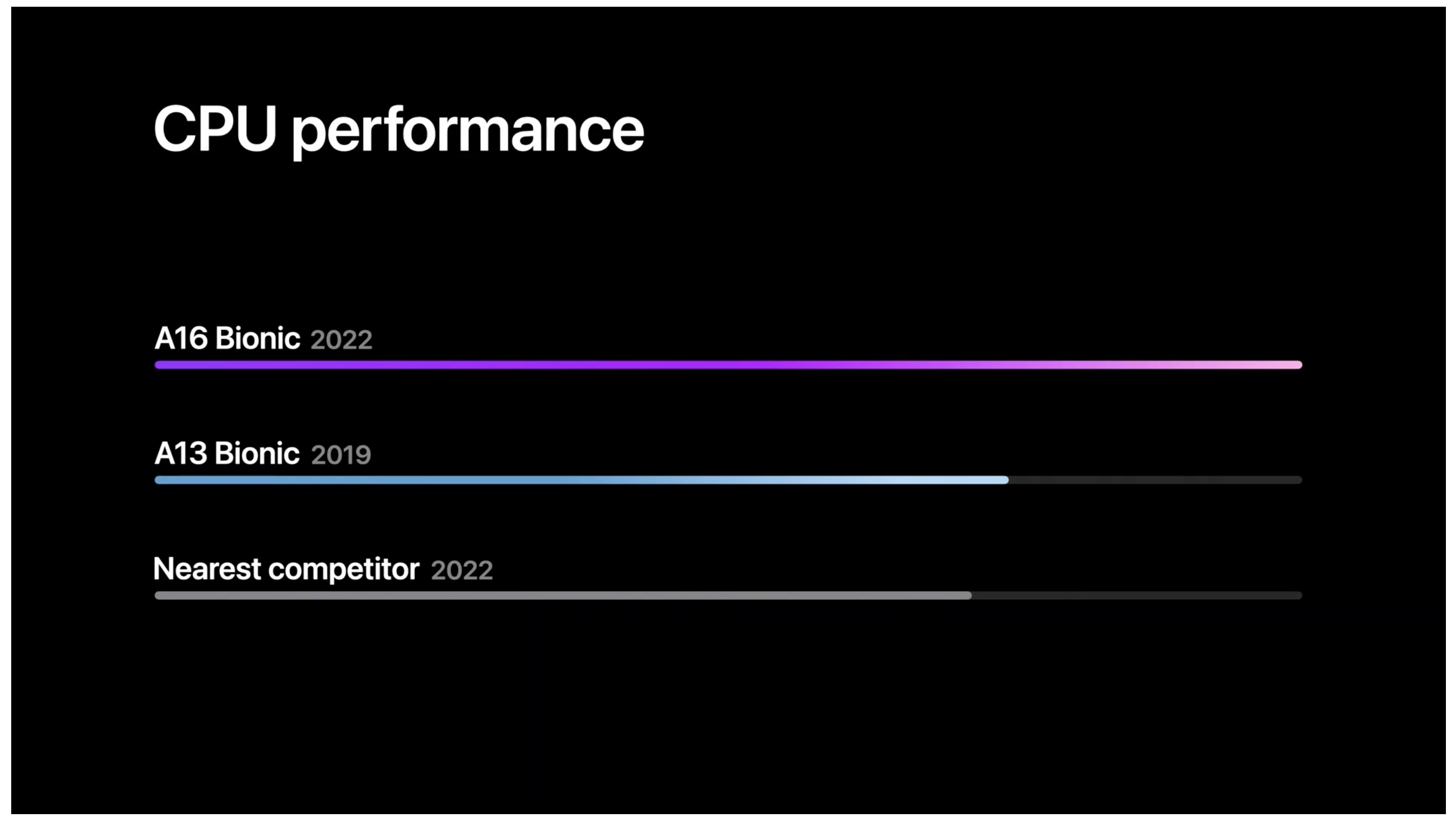 아이폰14 프로 시리즈에만 적용된 A16 Bionic 칩셋의 경우 4nm 공정, 160억 개의 트랜지스터로 더 좋은 전력 효율, 더 좋은 성능 경쟁 제품 (아마 퀄컴)보다 40% 더 빠르다고 이야기하고 있으며 같은 성능에서 경쟁 제품의 최고 효율에 3분의 1 전력만 소모합니다.
