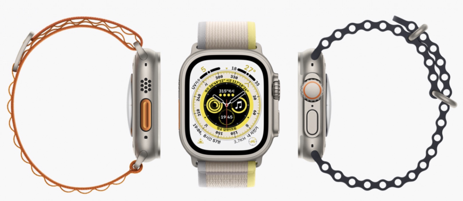 애플워치 울트라 밴드는 탐험가를 위한 알파인 루프, 다이버를 위한 오션 밴드, 마라톤 선수를 위한 트레일 루프 3종이 기본으로 선택할 수 있습니다.