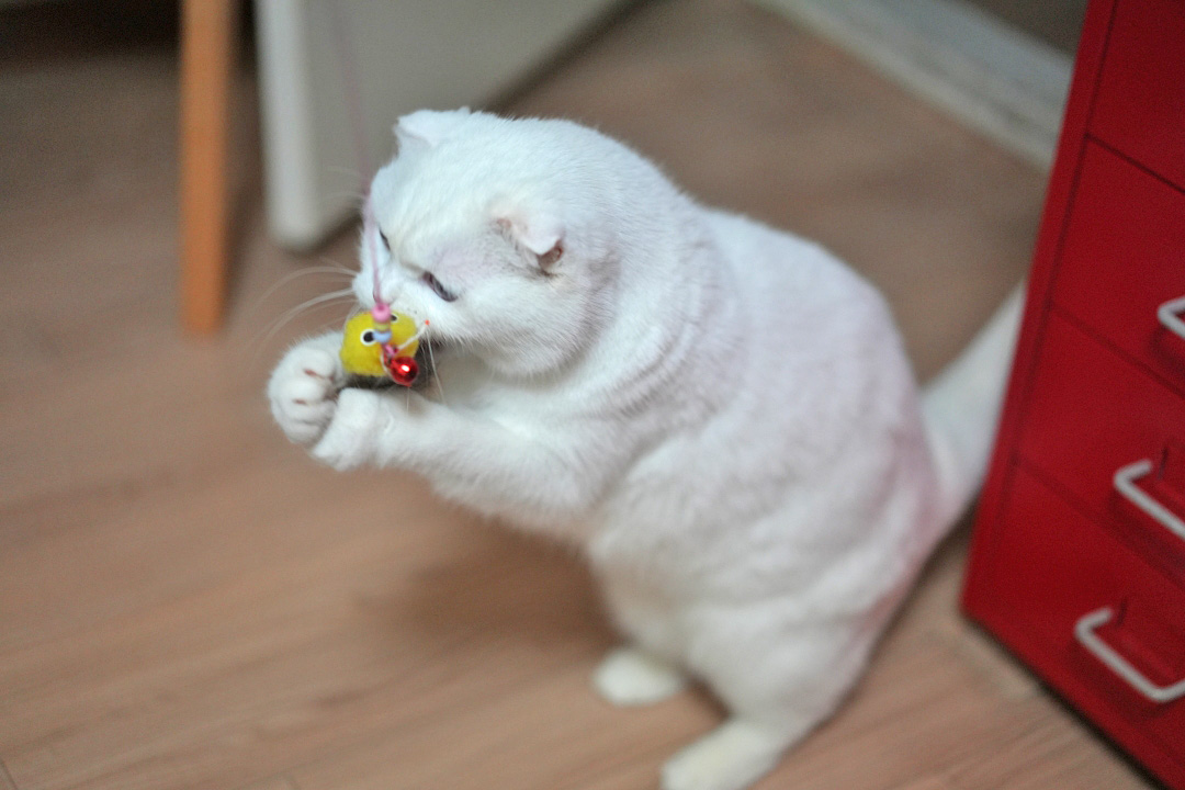 고양이 장난감으로 주로 행동을 유도하고 늘 집에서 축 늘어져있는 고양이의 활력을 키우는 방법이기도 하다.