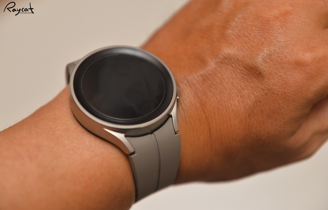 디자인이 크게 달라지진 않았지만 상단부 회전 베젤이 사라지면서 위쪽에 살짝 올라온 베젤은 갤럭시 워치5 프로의 디스플레이가 직접 바닥에 닿거나 혹시나 사용자가 아웃도어 활동 시 시계 표면이 직접 물체에 닿는 걸 방지해 줍니다.