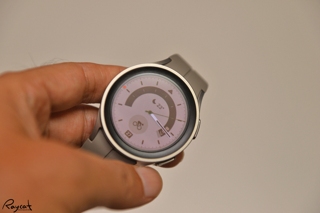 디자인이 크게 달라지진 않았지만 상단부 회전 베젤이 사라지면서 위쪽에 살짝 올라온 베젤은 갤럭시 워치5 프로의 디스플레이가 직접 바닥에 닿거나 혹시나 사용자가 아웃도어 활동 시 시계 표면이 직접 물체에 닿는 걸 방지해 줍니다.