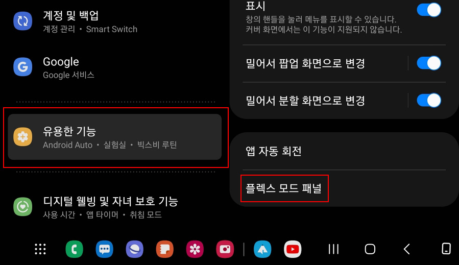 갤럭시 Z 폴드4의 경우 큰 화면 덕분에 Z 플립4 보다 플렉스 모드의 활용도가 더 큰 편인데 갤럭시 Z 플립4도 설정 유용한 기능에서 플렉스 모드 패널을 확인할 수 있습니다.