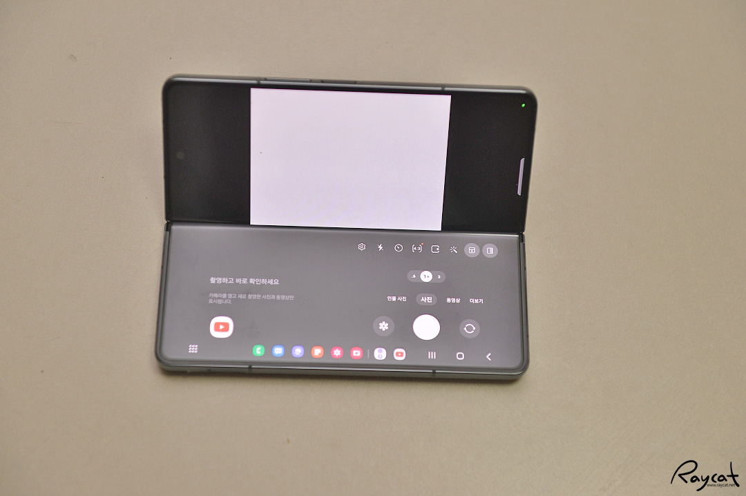 완전히 반으로 접을 필요도 없으며 어느정도 스마트폰을 접으면 플렉스 모드로 바뀌며 거기에 맞춰 UI가 바뀝니다.