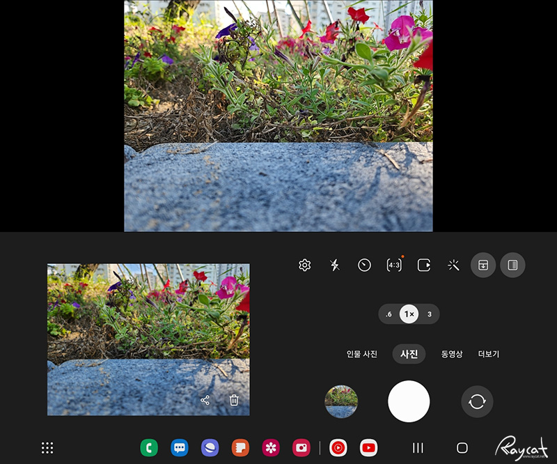 플렉스 모드로 사용하게 되면 한쪽은 피사체를 보며 촬영할 수 있게 되며 한쪽은 사진 촬영용 인터페이스로 바뀌며 한쪽에 방금 촬영한 사진이 보이게 됩니다.