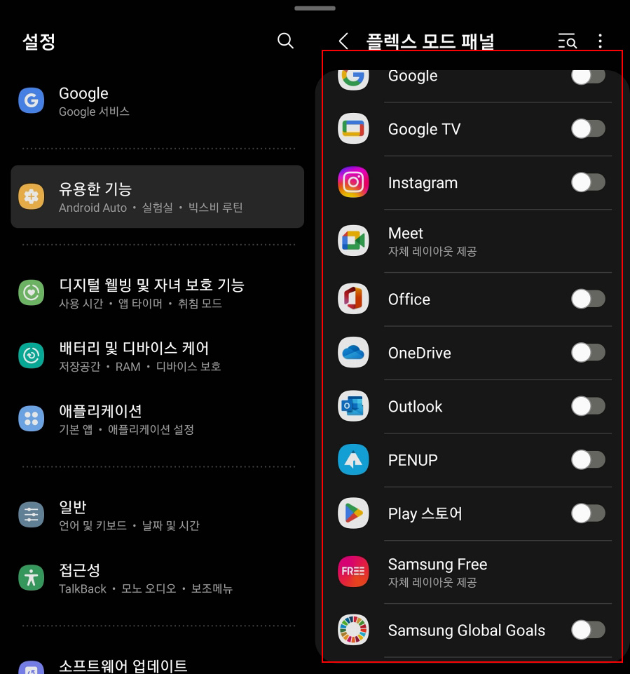 참고로 기본 설정은 실험실의 플렉스 모드가 적용된 앱들은 OFF 상태로 보이게 됩니다.