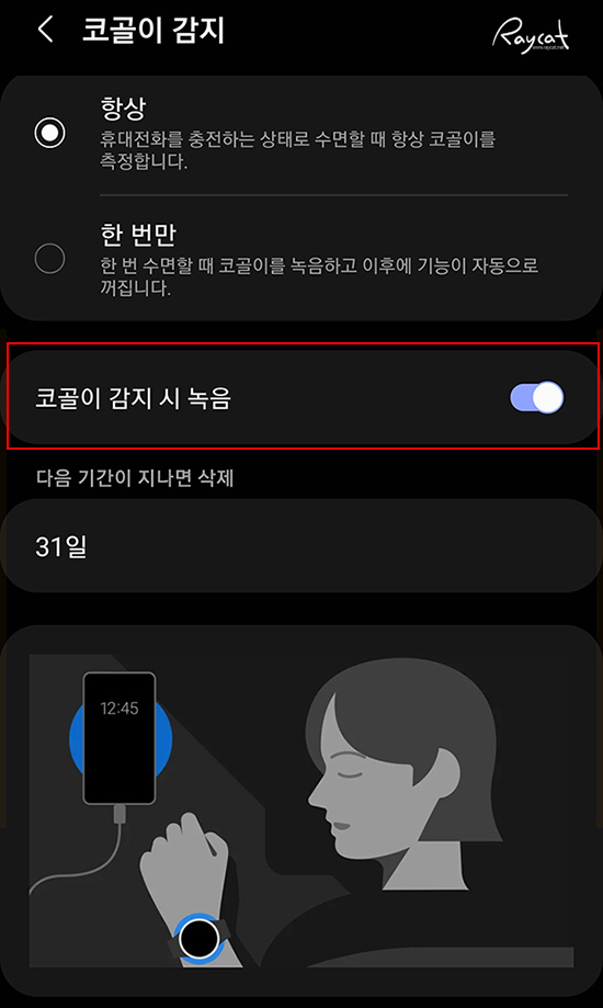 스마트폰 워치5 설정에서 코골이 감지를 켜고 코골이 감지 시 녹음 까지 켜두면 코골이를 하면 스마트폰 마이크를 활용 녹음이 됩니다.