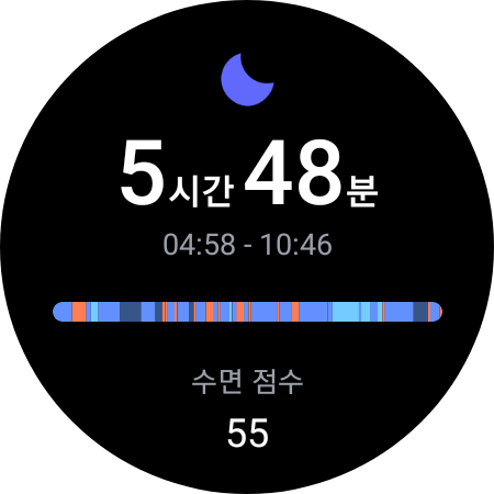 잠을 꽤 늦게 자는 이유도 있지만 잠을 깊게 못 자서 그런지 새벽에 잠든날 측정한 데이터를 보면 수면 점수가 55로 좋은편이 아닙니다.