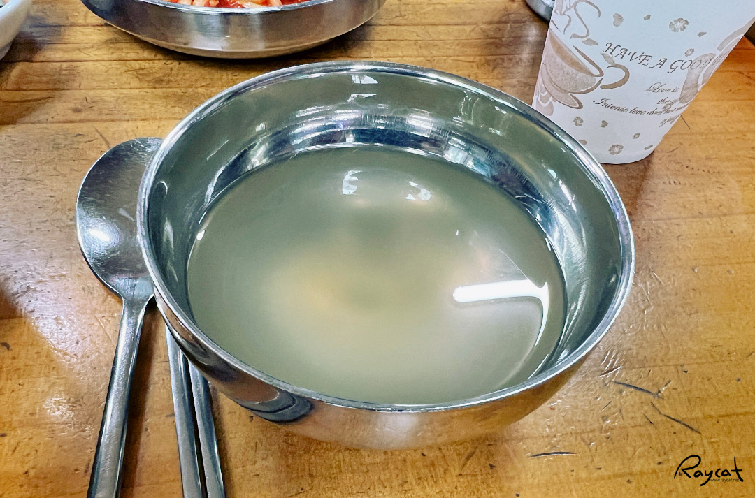 칼비빔국수가 나오기 전 칼국수 육수를 맛보라고 조금 주는데 옛김포식당의 육수는 호불호가 갈릴 것 같은데 심심한 맛으로 해산물을 넣어서 우려낸 느낌을 주는 국물 맛이다. 개인적으로 이 육수를 그렇게 좋아하지 않아서 아마 사람마다 좀 다르게 느낄 것 같다.