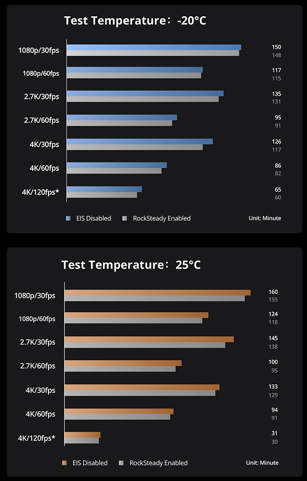 제조사에서 공개한 배터리 타임 데이터를 보면 최대 시간은 1080p/30fps를 기준으로 측정한 시간이며 요즘 보통 4K로 영상 촬영을 많이 하는데 4K/120fps 기준으로 보면 1시간 정도가 최대 타임으로 볼 수 있습니다.