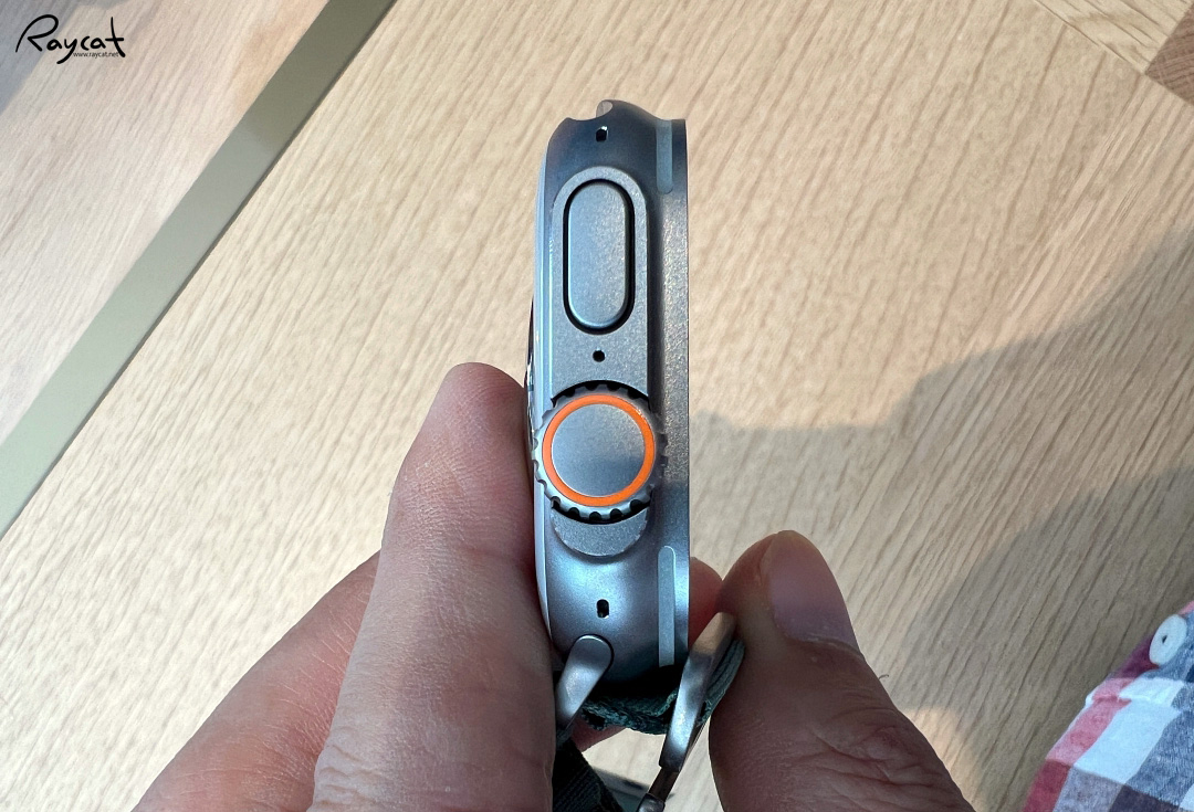 애플워치 울트라의 오른쪽에는 기존 애플워치와 똑같이 크라운과 버튼이 있으며 왼쪽에 애플워치 울트라에 추가된 맞춤형 동작 버튼과 86 데시벨의 사이렌을 울리는 스피커가 있습니다.