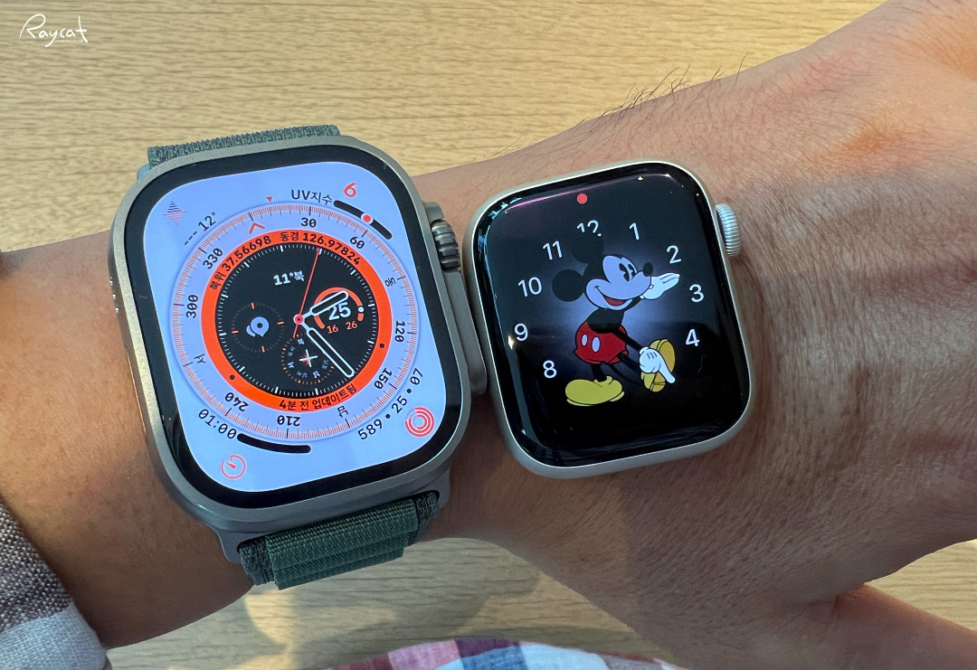애플워치 울트라와 애플워치8과 크기를 비교해 보면 위 사진과 같은 차이가 있습니다. 위 사진의 애플워치 울트라는 49mm 이며 애플워치8은 41mm로 애플워치 울트라를 보다가 애플워치8을 보면 귀여운 느낌을 줍니다.