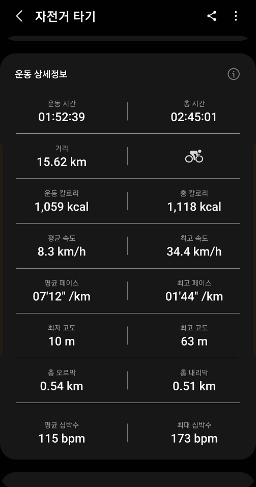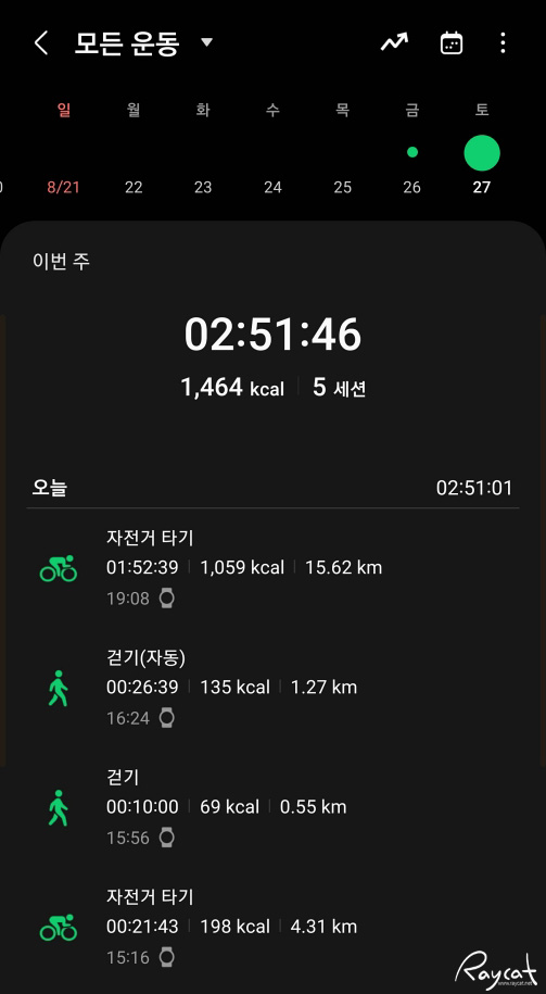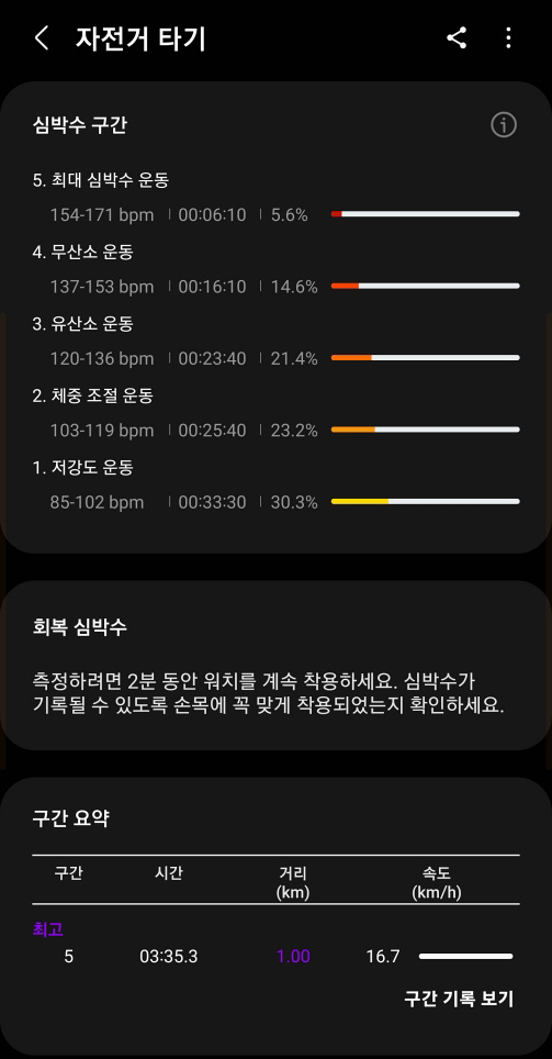 특히 자전거 라이딩이나 달리기의 경우 구간 기록이 1km 마다 측정이 되며 구간별로 기록이 꽤 세분화되어 측정이 되기 때문에 운동 활동에 꽤 많은 도움이 됩니다. 운동 중 심박수도 함께 측정되기 때문에 건강 상태 체크도 함께하며 일반 걷기보다 확실히 자전거 라이딩을 할 때 심박수가 꽤 많이 올라간 것을 확인할 수 있습니다.
