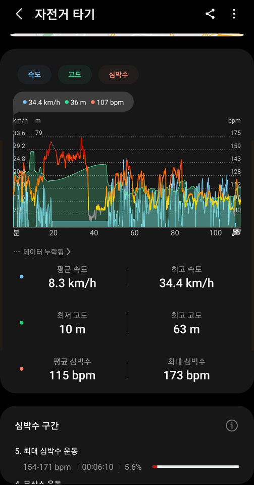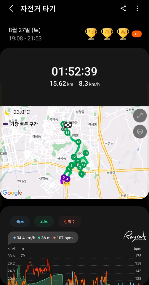 특히 자전거 라이딩이나 달리기의 경우 구간 기록이 1km 마다 측정이 되며 구간별로 기록이 꽤 세분화되어 측정이 되기 때문에 운동 활동에 꽤 많은 도움이 됩니다. 운동 중 심박수도 함께 측정되기 때문에 건강 상태 체크도 함께하며 일반 걷기보다 확실히 자전거 라이딩을 할 때 심박수가 꽤 많이 올라간 것을 확인할 수 있습니다.