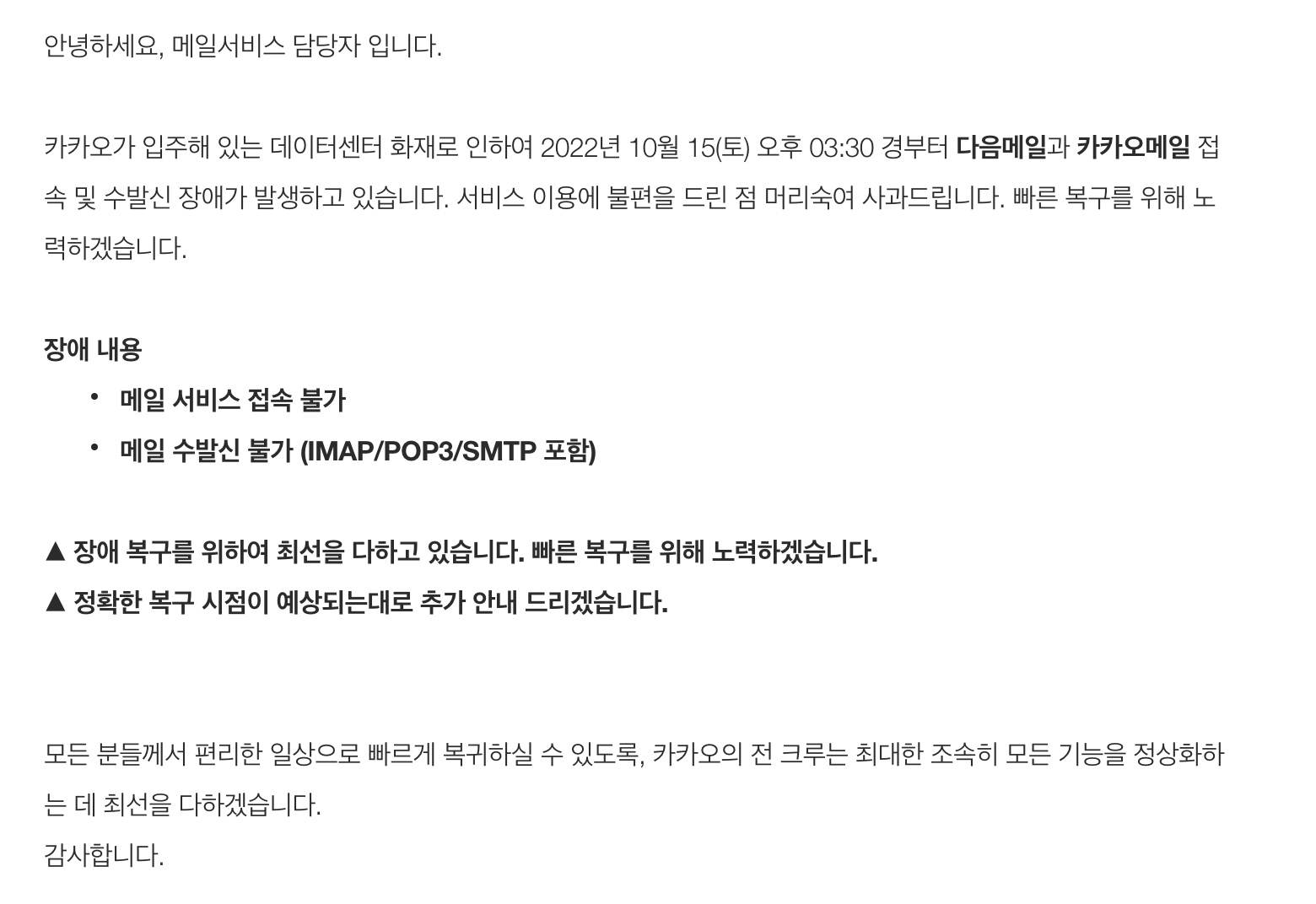 그리고 메인 메일을 다음으로 사용하고 있었던 분들도 지금 메일 자체를 사용할 수 없으니 난감하네요.