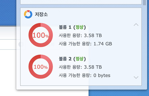 저도 시놀로지 NAS를 데이터 백업과 웹서버로 설정해 외부에서 접속 데이터 백업 용도로 사용 중인데 갑자기 저장공간이 꽉 찼다는 메시지와 함께 더 이상 NAS에 사용할 여유 공간이 없음을 확인했습니다.