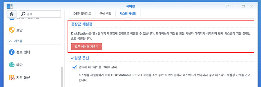 시놀로지 나스의 경우 공장 초기화를 하는 방법이 두 가지인데 하드웨어에서 리셋 버튼을 눌러하는 방법과 DSM에서 제어판 시스템 재설정에 보면 공장값 재설정이 있습니다.