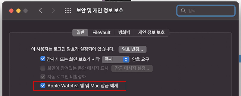 보안 및 개인 정보 보호에서 Apple Watch로 앱 및 Mac 잠금 해제에 체크합니다.