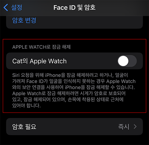 그리고 아이폰의 경우도 애플워치를 손목에 착용하고 있다면 자동 잠금해제를 사용할 수 있는데 설정에서 애플워치 설정을 해주면 사용할 수 있습니다.