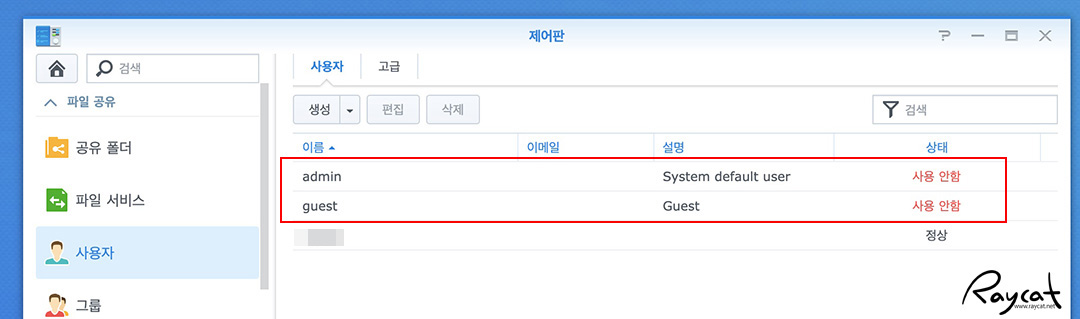 시놀로지 NAS의 제어판 - 사용자에서 admin 계정과 guest 계정 사용 안함으로 바꾸고 admin 계정은 꼭 필요할 때만 활성화해서 사용하는 게 좋습니다.