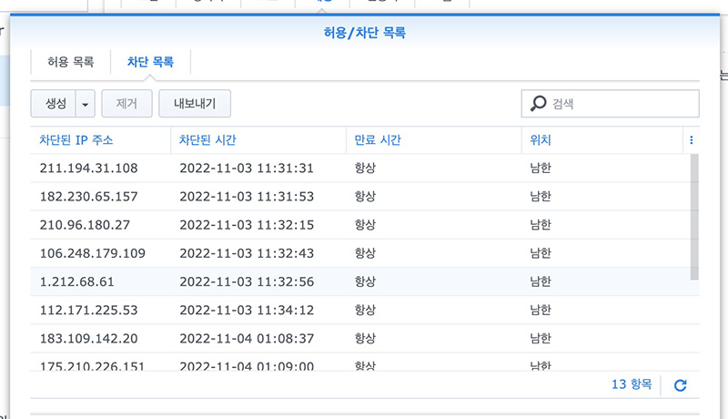 차단 목록을 보면 외부에서 접속 시도가 꽤 많았음을 알 수 있는데 차단 만료일을 활성화하지 않으면 한번 차단된 IP는 영구적으로 나스에 접속이 차단되게 됩니다.