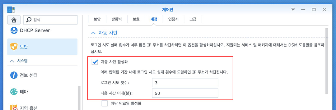 로그인 자동 차단 활성화해두기로 로그인 시도 횟수와 시간 내 잦은 접속을 시도할 경우 자동으로 차단되도록 해두면 외부인의 비정상적인 접속을 막을 수 있습니다.