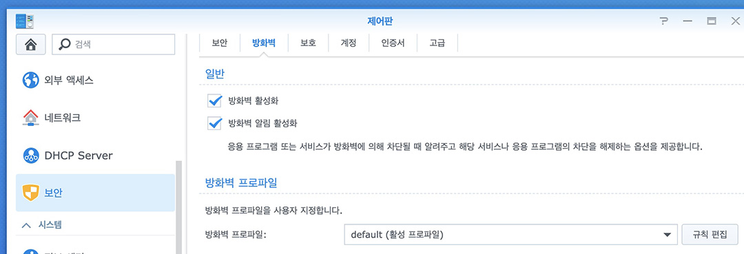 시놀로지 NAS의 보안에서 방화벽을 활성화하고 방화벽 알림 활성화에 체크를 해둡니다.