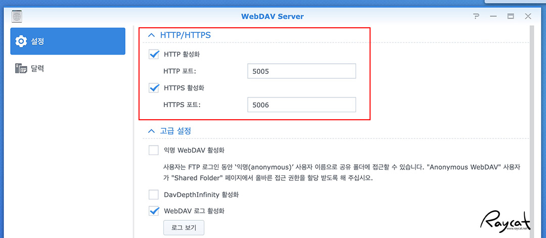 위 캡처 화면의 예는 WebDAV Server로 http와 https의 활성화 포트가 기본으로 5005와 5006으로 지정되어 있습니다.