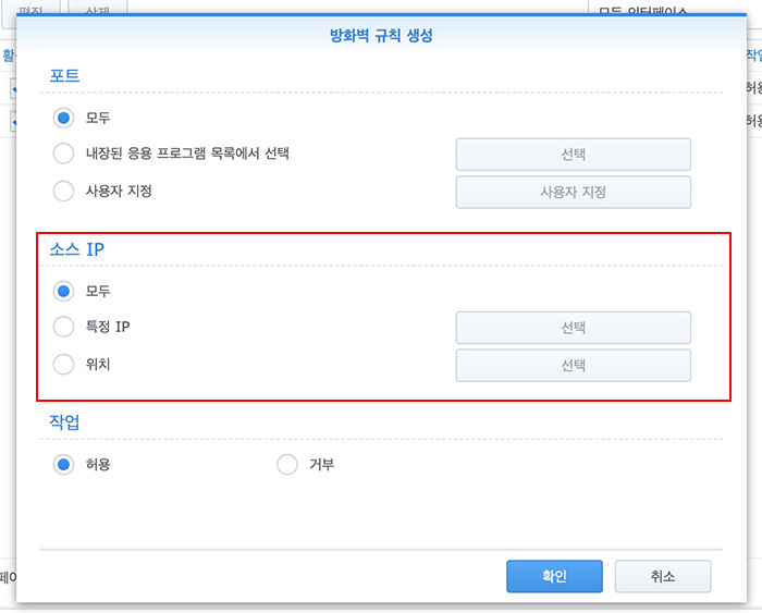 만약 특정 IP만 거부하거나 혹은 접속할 수 있도록 바꾸고 싶다면 방화벽 규칙 생성에서 특정 IP를 선택 규칙을 편집하면 됩니다. 저는 예전부터 나스를 해외에서 접속해 데이터 백업용으로 자주 사용했습니다.