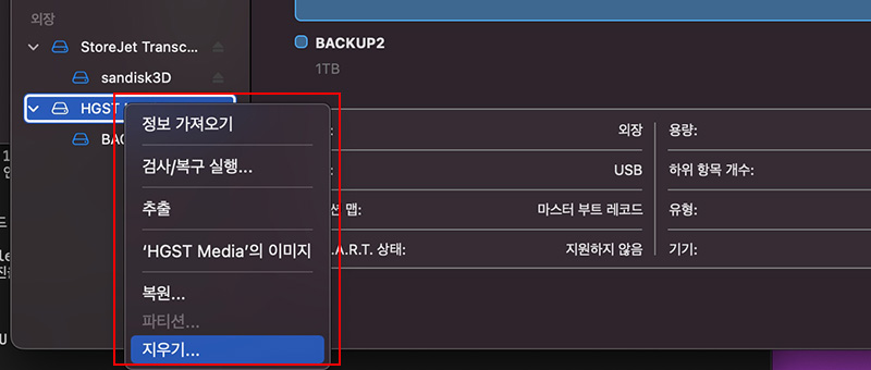그리고 오류가 나서 복구가 되지않는 디스크의 경우 지우기를 통해 다시 포맷해 검사해 보는 방법도 있습니다. 디스크 포맷 역시 디스크 유틸리티에서 실행할 수 있습니다.