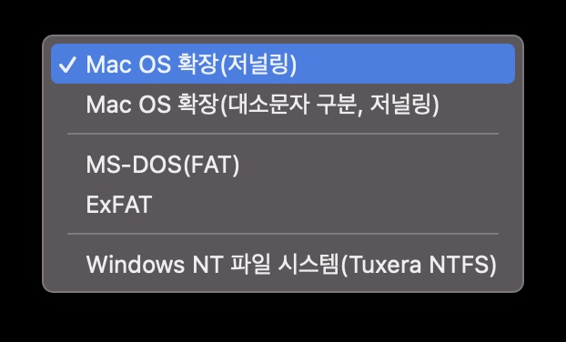 맥 OS에서 디스크 포맷 방식은 MS-DOS의 FAT까지 지원하지만 가장 보편적인 방식은 Mac OS 확장(저널링)을 선택하는 것이 가장 안정적으로 저장장치를 사용할 수 있습니다. 다른 포맷 방식도 지원하고 있지만 간혹 이동형 저장장치를 맥외에 윈도나 다른 PC에 연결하는 경우 오류가 나는 경우가 있으니 참고하세요.