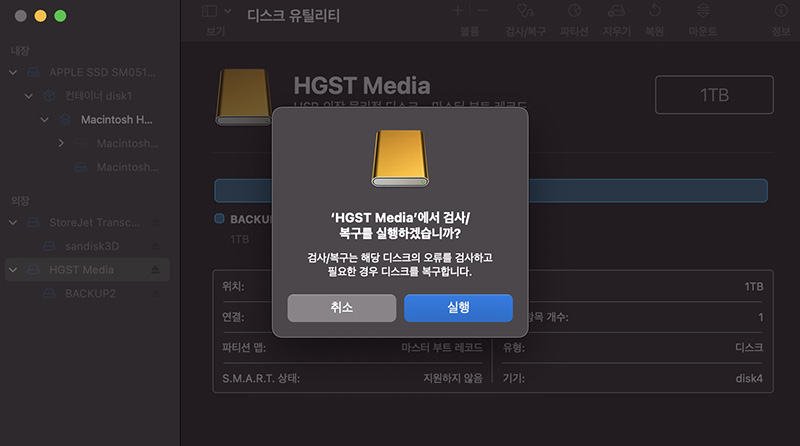 만약 저장장치에 오류가 있거나 문제가 있을 경우 디스크 검사와 복구도 디스크 유틸리티에서 실행할 수 있습니다.