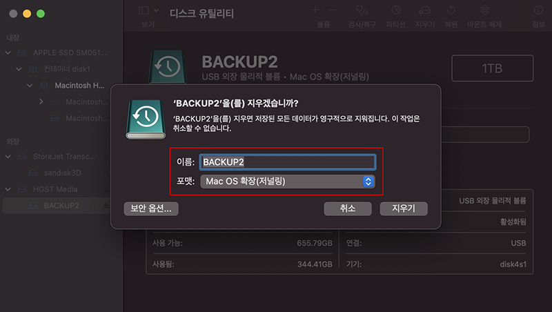 그리고 오류가 나서 복구가 되지않는 디스크의 경우 지우기를 통해 다시 포맷해 검사해 보는 방법도 있습니다. 디스크 포맷 역시 디스크 유틸리티에서 실행할 수 있습니다.