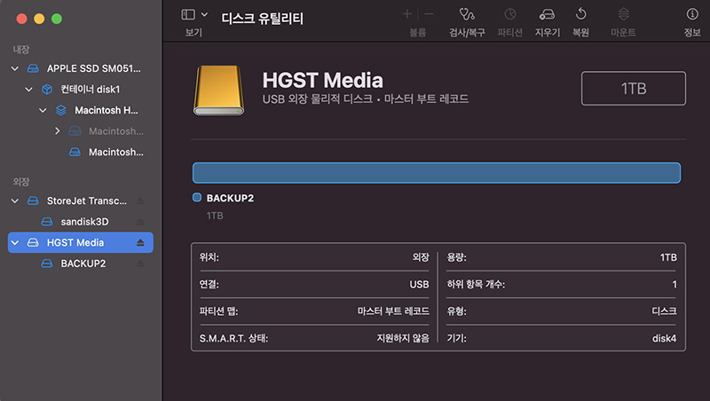 디스크 유틸리티를 실행하면 아래처럼 맥에 연결된 모든 물리적 저장장치를 확인할 수 있습니다. 디스크 유틸리티는 저장장치에 오류가 있으면 복구하거나 포맷 할 수 있습니다.