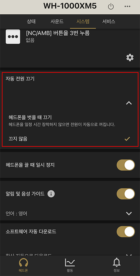소니 헤드폰 WH-1000XM5의 경우 헤드폰을 벗고 일정 시간 장착하지 않으면 자동으로 전원이 꺼지는데 이것을 끄지 않음으로 해두면 계속 전원이 ON 상태로 유지됩니다.