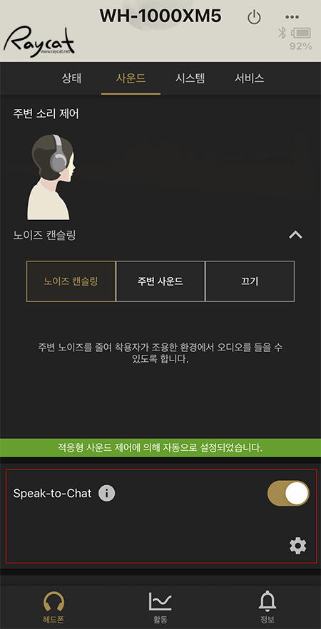 그리고 사운드 제어에서 Speak-to-Chat 기능을 켜두면 사용자가 대화를 하거나 사람의 목소리가 인식되면 사운드가 줄면서 주변의 대화 소리가 더 뚜렷하게 들리게 됩니다. 사람 음성에 대한 인식 기능이 상당히 뛰어난 편이기도 합니다.