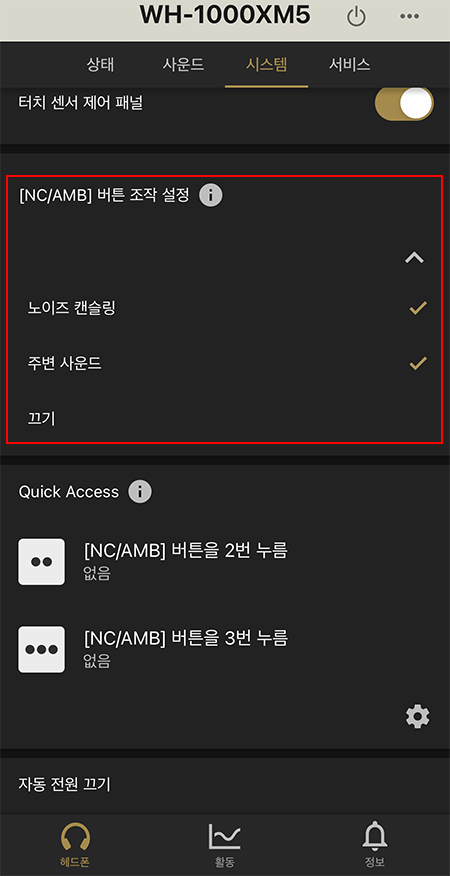 헤드폰의 버튼 조작이나 기능 지정도 시스템에서 지정해 사용할 수 있습니다. 헤드폰을 사용하다 조금 익숙해지면 퀵액세스 기능을 버튼에 지정해두고 사용하면 더 편합니다.