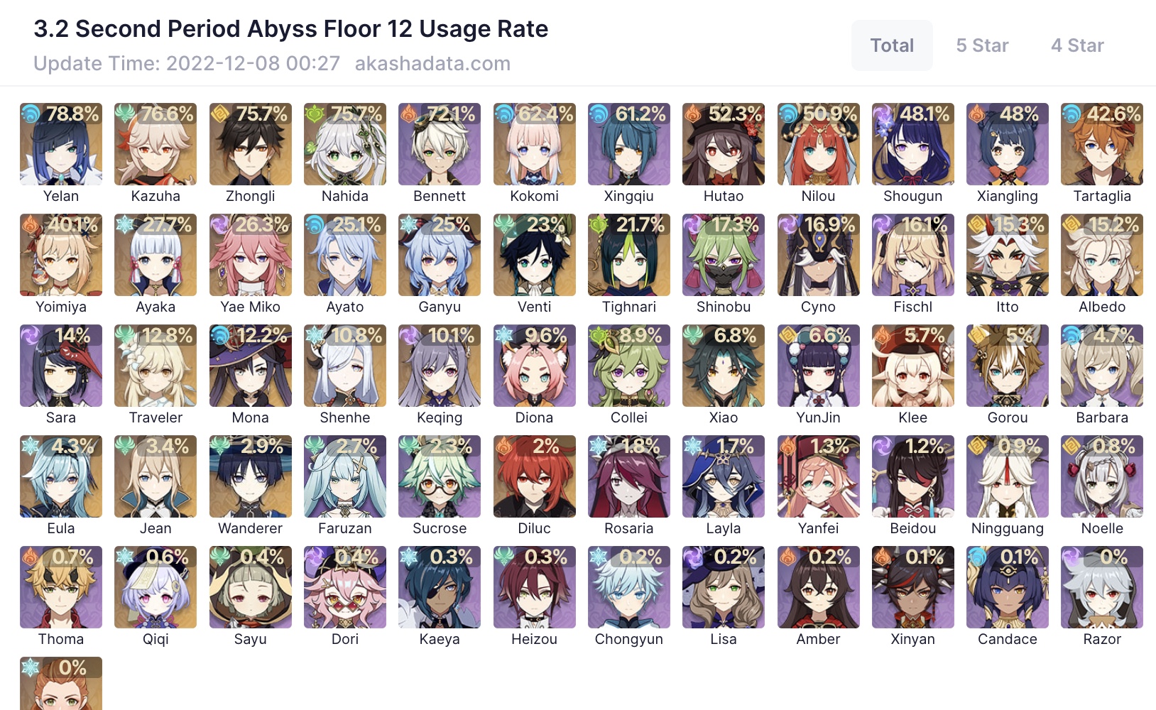 원신은 사람들마다 플레이하는 스타일도 다르고 캐릭의 조합이 다를 수 있어서 통계를 보면 다른 사람들이 어떻게 운용하고 있는지 볼 수 있어서 클리어하는데 도움이 되기도 합니다. 모든 기준은 나선비경 12층 36별을 통계로 만들어진 데이터입니다.
