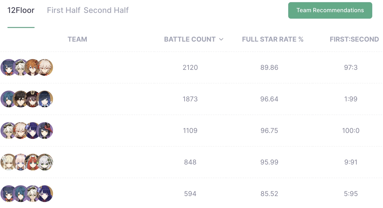 참고로 원신 나선비경 통계 데이터는 아래 사이트에서 확인할 수 있으며 통계를 보면 본인이 가진 캐릭터들로 조합을 만드는데 도움이 됩니다. 단 플레이어마다 캐릭 육성도가 다르기 때문에 조합을 만들기 어려울 때 참고용으로 보기에 괜찮습니다.