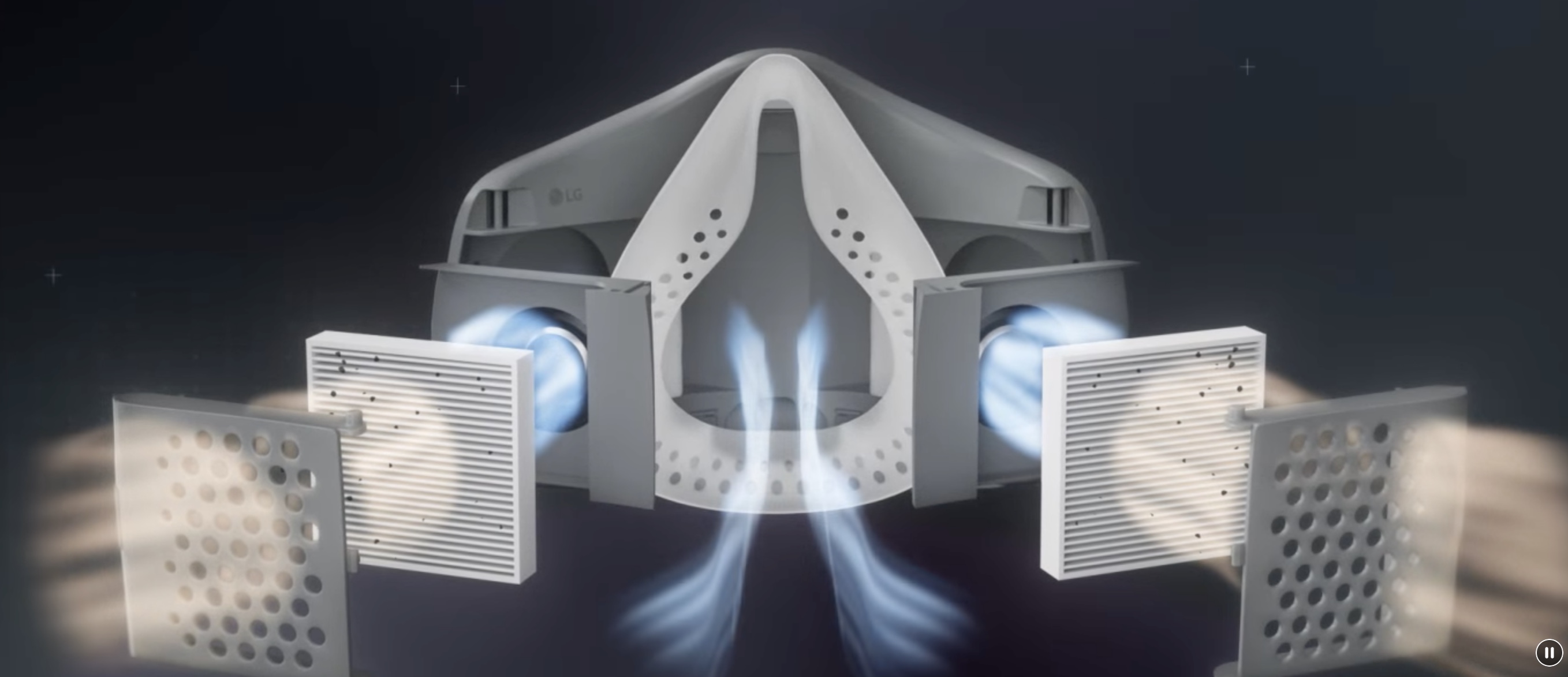 LG 퓨리케어 마스크는 좌우에 각각 공기가 지나가는 팬이 있으며 들숨과 날숨을 감지하는 호흡 센서로 운동 시 호흡량에 따라 두 개의 팬 속도를 알아서 조절해 마스크를 거치는 공기의 유입량을 제어하게 됩니다.