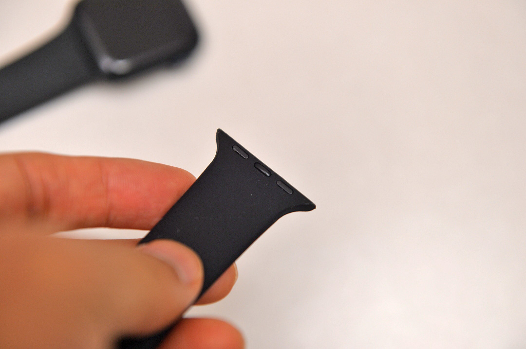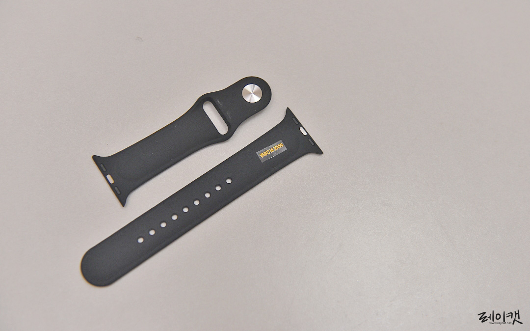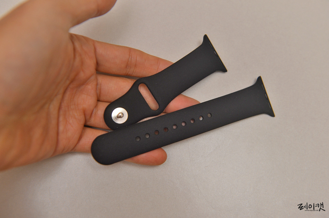 보통 이런 공산품은 메이드 인 차이나죠. 홀에 끼우는 핀 부분의 마감이 좀 약해 보이는 느낌이 있고 정품 스포츠 밴드보다 다이소 실리콘 밴드는 두께가 조금 얇은 편이며 안쪽으로 홈이 없습니다.